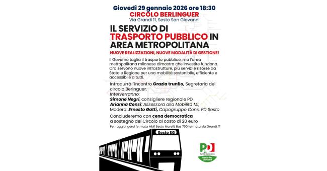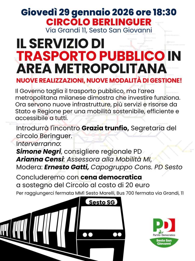 Il giorno 29 gennaio c.a. alle ore 18.30 se ne discuterà insieme ad Arianna Censi (Assessora alla Mobilità MI), Simone Negri (Consigliere Regionale PD) ed Ernesto Gatti (Capogruppo Cons. PD Sesto)
