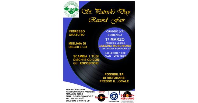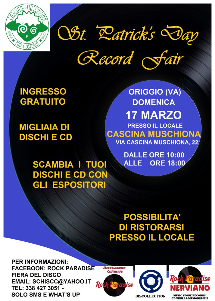 In occasione della festa di SAN PATRIZIO, presentiamo la  ST. PATRICK'S DAY RECORD FAIR , domenica 17 MARZO ad ORIGGIO presso il PUB CASCINA MUSCHIONA situato in VIA CASCINA MUSCHIONA  22.