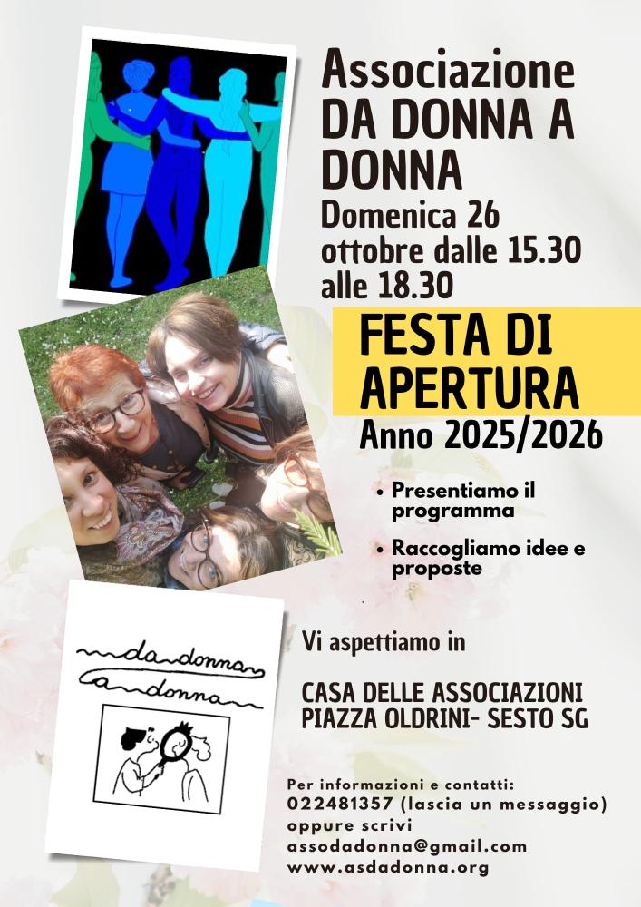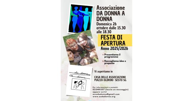Si terrà domenica 26 ottobre dalle 15h30 alle 18h30 a Sesto San Giovanni presso la Casa delle associazioni (piazza Oldrini) la Festa di apertura annuale dell'associazione DA DONNA A DONNA.