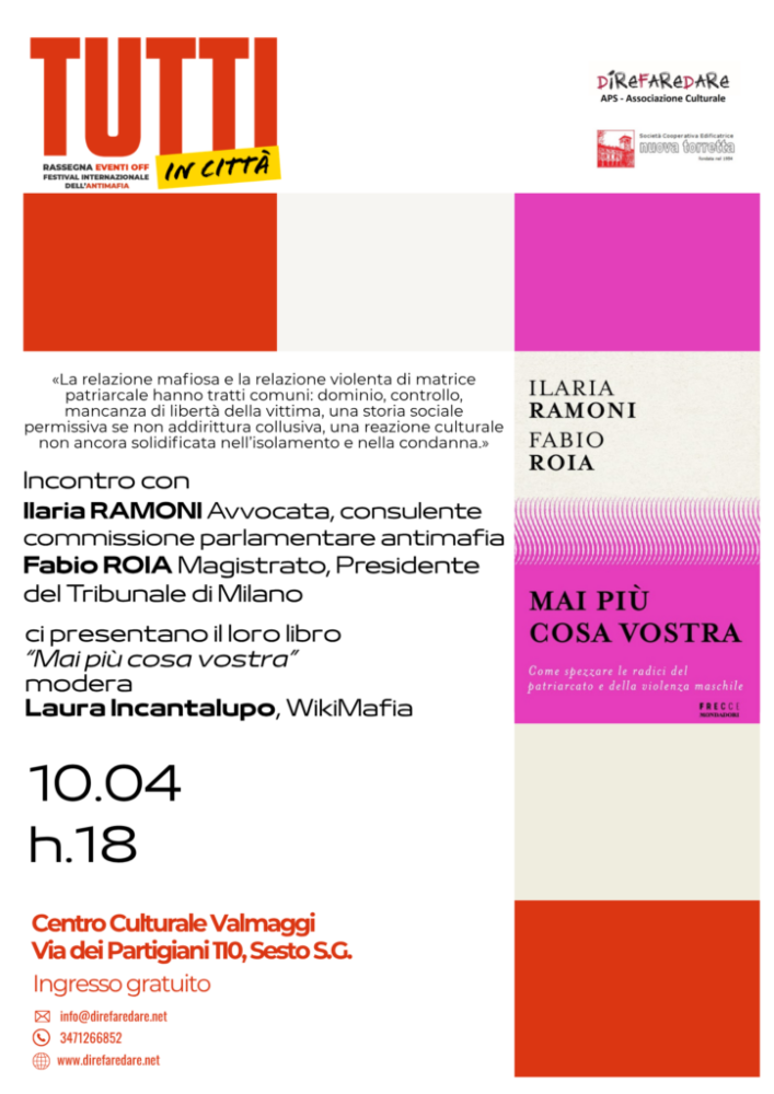 All’interno del Festival Internazionale dell’Antimafia di WikiMafia, presentiamo il libro “Mai più cosa vostra” scritto a quattro mani da Ilaria Ramoni, avvocata consulente della Commissione parlamentare antimafia, si è sempre occupata di diritti umani, nonché della tutela delle vittime di mafia, di crimini violenti e di crimini d’odio, approfondendo le tematiche di genere nel diritto, e Fabio Roia presidente del Tribunale di Milano, è stato componente del Consiglio Superiore della Magistratura dal 2006 al 2010, si è sempre occupato di reati riguardanti la violenza di genere.