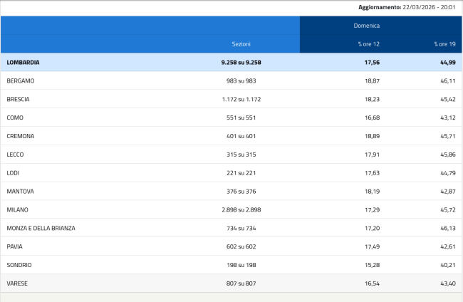 Qui di seguito i dati (regionali e relativi alla città di Sesto San Giovanni) relativi all'affluenza nella giornata di domenica 22 marzo: