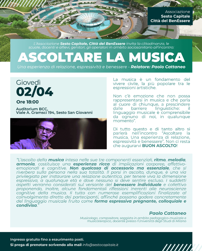 Giovedì 2 aprile 2026 alle ore 18:00, presso l’Auditorium della Bcc in Viale Gramsci 194 a Sesto San Giovanni, si terrà l’iniziativa “Ascoltare la musica: un’esperienza di relazione, espressiva e benessere”, a cura di Paolo Cattaneo. L’evento è promosso dal comitato scientifico dell’Associazione SestoCapitale Città del BenEssere e si propone come un momento di riflessione e condivisione sul valore universale della musica.