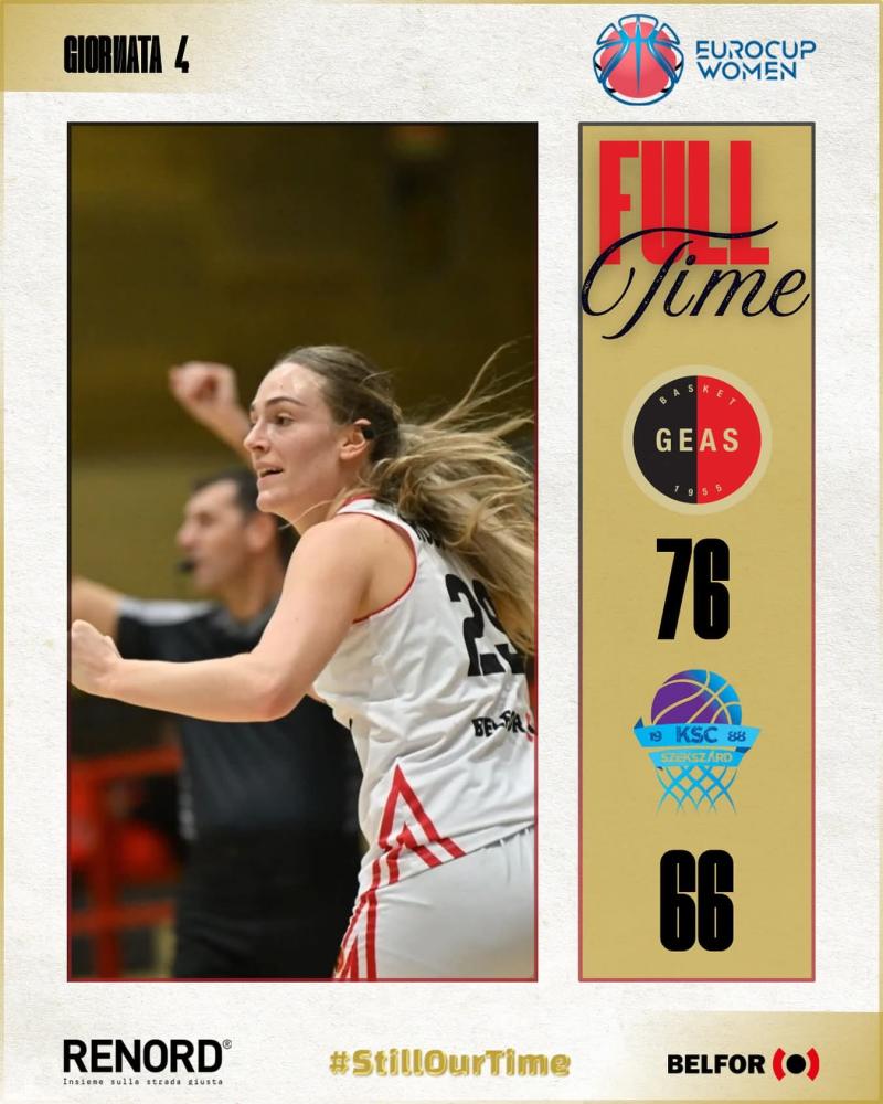 Risultato finale: GEAS Basket 76 – Tarr KSC Szekszard 66, con il GEAS che vince e ribalta la differenza canestri.
