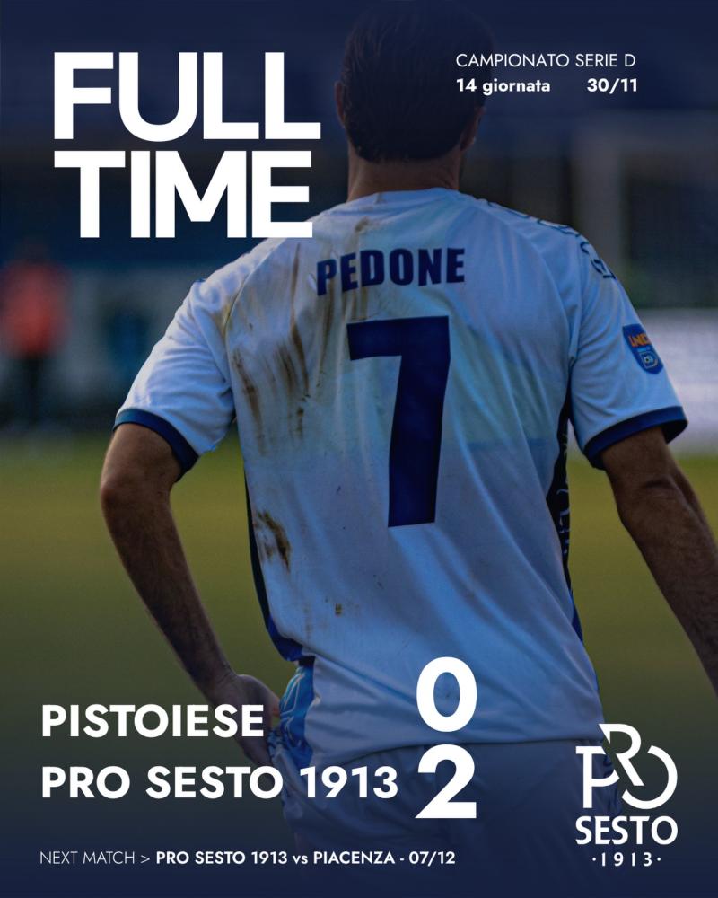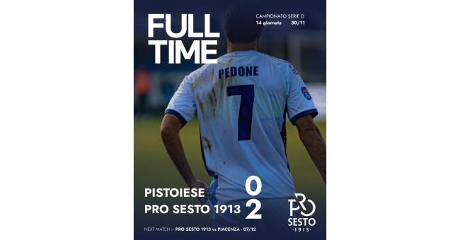 La Pistoiese agevola la Pro Sesto al 44’ quando Campagna viene espulso per doppia ammonizione. Nonostante l’inferiorità numerica, la squadra di Andreucci sfiora il pari con una conclusione di Russo che termina di poco a lato. La Pro Sesto cinicamente raddoppia in avvio di ripresa con Pedone, che al 2’ trova il 2-0 con un destro da fuori area. La Pistoiese prova comunque a reagire: al 10’ Biagi va in spaccata su una punizione laterale, ma Lovato respinge di pugno.