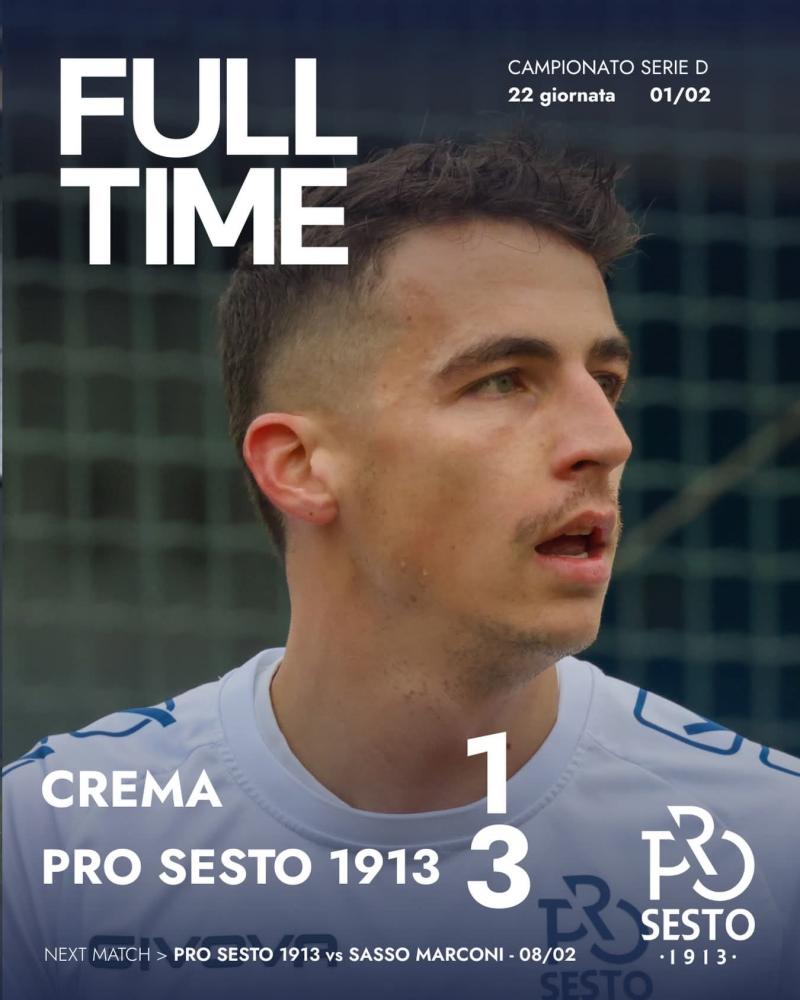 Una vittoria bella della Pro Sesto che premia i ragazzi di mister Angellotti che sono riusciti a creare occasioni e finalizzarle con pragmatismo e risolutezza. Il Crema 1908 ha tentato l’impresa di strappare punti alla corsa della Pro Sesto ma deve tornare a casa a bocca asciutta. Il risultato finale recita 3-1 per gli ospiti e lascia i nerobianchi con tanto rammarico perché la sensazione è stata netta: due squadre che hanno lottato ad armi pari ma alla lunga e' venuta fuori la qualità e la voglia di vincere dei biancocelesti.