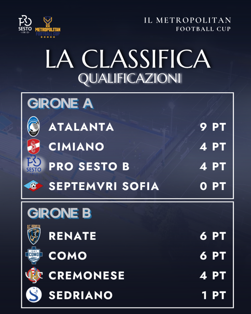 Seconda giornata di qualificazioni nella VII edizione del Metropolitan Cup: le prime sfide della giornata hanno visto protagonisti Cremonese-Sedriano e Alcione-Accademia Pavese, terminate rispettivamente 0-0 e 1-1.