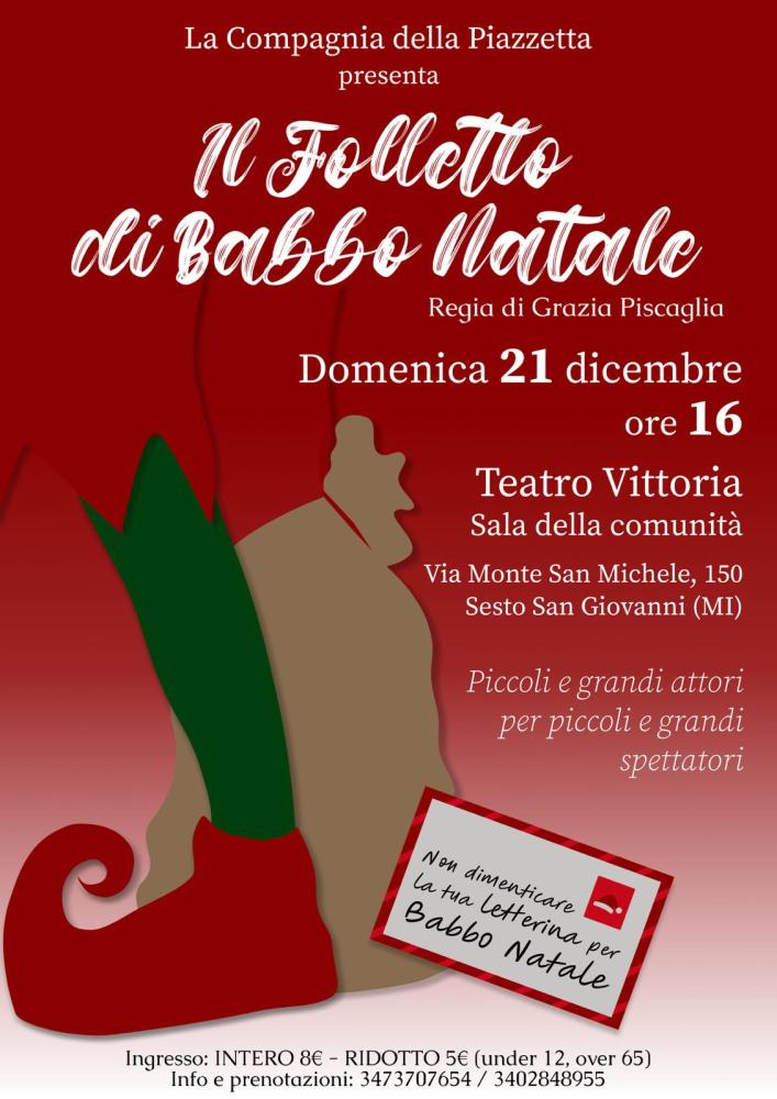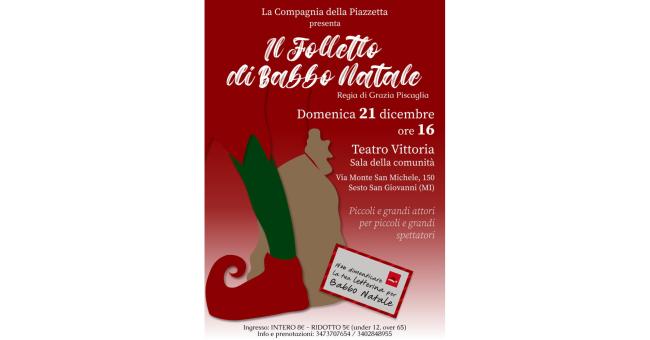 A Sesto San Giovanni il 21 dicembre alle ore 16:00 presso il Teatro Vittoria (Sala della comunità ) in via Monte San Michele 150 ci sarà lo spettacolo "Il Folletto di Babbo Natale".