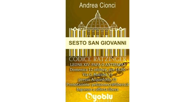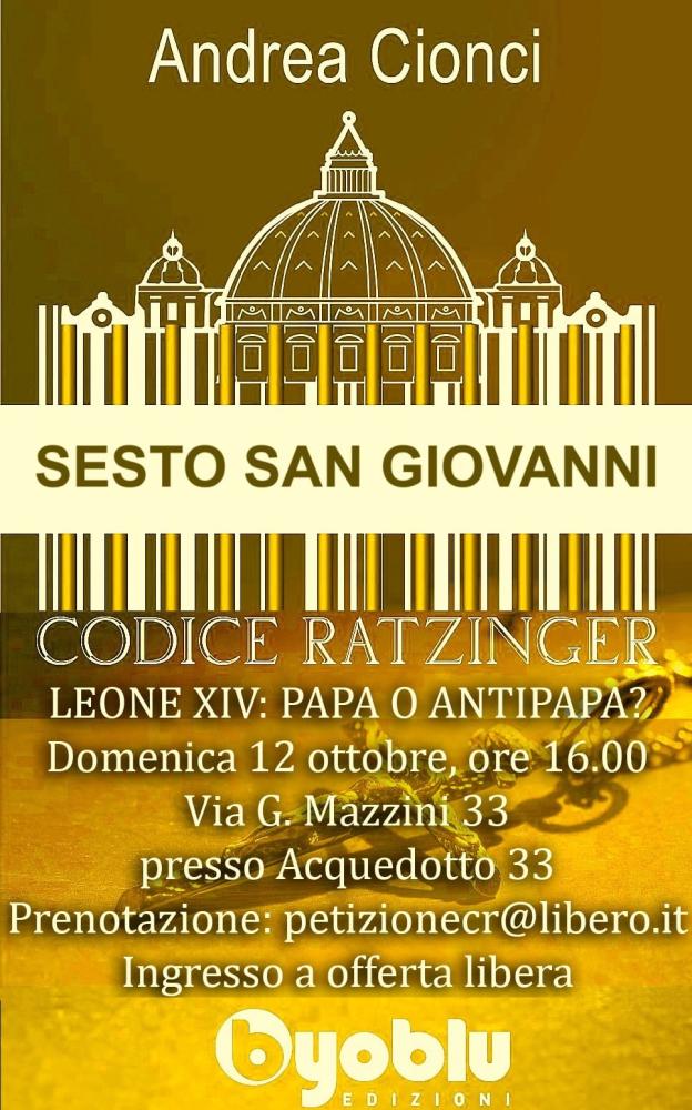 Domenica 12 ottobre 2025 alle ore 16:00 in Via G. Mazzini 33 presso Acquedotto 33 - Sesto San Giovanni ci sarà la presentazione del libro bestseller 2022 “CODICE RATZINGER”.