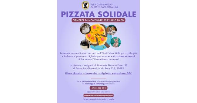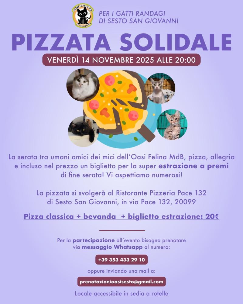 Venerdi 14 novembre sarà una serata all’insegna del gusto e della solidarietà ! Ritorna la Pizzata Solidale dell’Oasi Felina MdB, un’occasione speciale per sostenere i nostri amici a quattro zampe e condividere un momento di convivialità tra amanti degli animali.