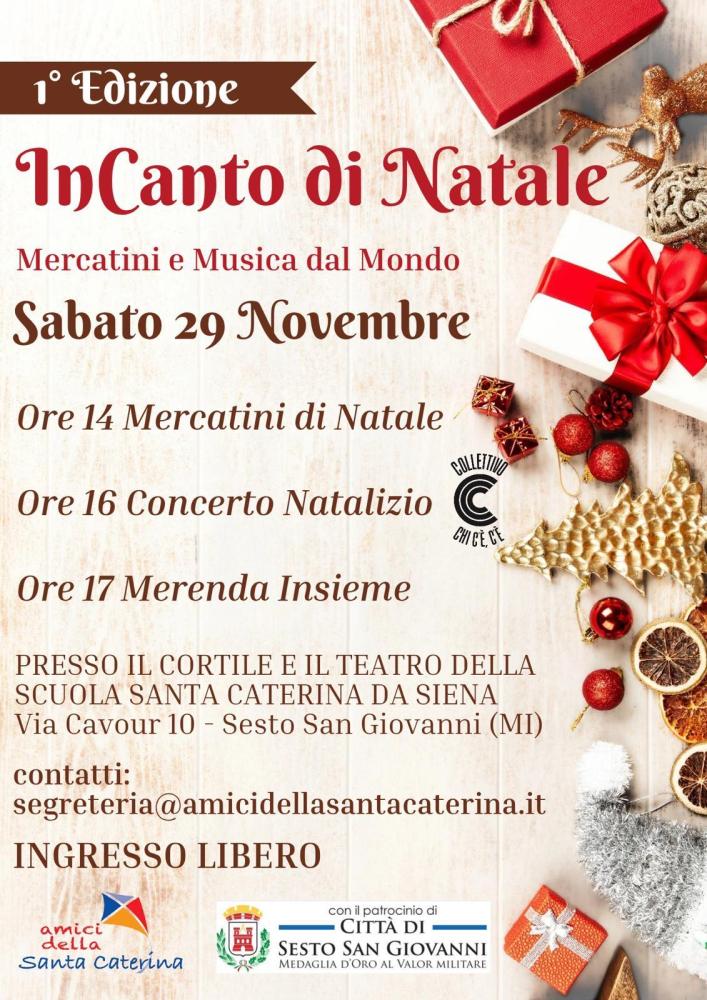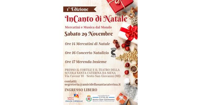 Sabato 29 novembre a partire dalle ore 14 presso il cortile dell'Istituto Santa Caterina da Siena (via Cavour 10, Sesto San Giovanni) ci sarà l'evento "InCanto di Natale": una occasione per vivere i mercatini artigianali proposti dall'Associazione "Amici della Santa Caterina" e assistere a un concerto, con musiche dal mondo, promosso dal Collettivo CCC.
