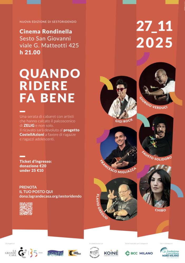 Sestoridendo torna giovedì 27 novembre alle ore 21:00 con lo spettacolo “Quando ridere fa bene”: Fausto Solidoro, Giorgio Verduci, Flavio Oreglio, Francesco Migliazza, Chibo e Gigi Rock si esibiranno sul palco del Cinema Rondinella di Sesto San Giovanni. I comici protagonisti di Zelig ci aiuteranno a sostenere il progetto CostellAzioni, promosso da Fondazione Comunitaria Nord Milano in partnership con le aziende consortili Comuni Insieme, Ipis e Sercop, i Comuni di Sesto San Giovanni e Cologno Monzese e con Fondazione Paganelli. Il progetto