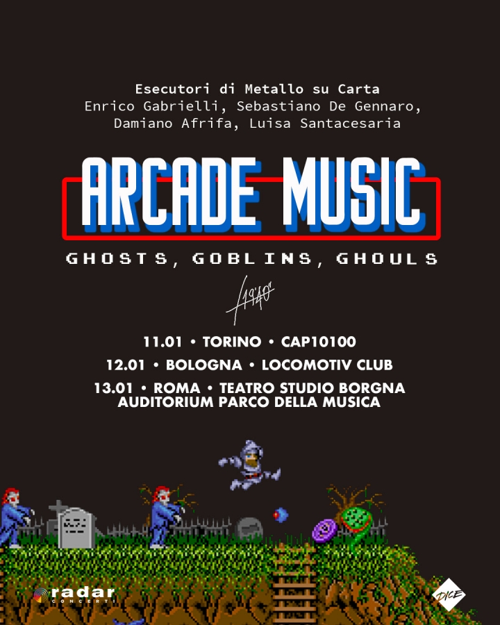 RADAR Concerti annuncia ARCADE MUSIC: GHOSTS, GOBLINS, GHOULS. Il progetto degli Esecutori di Metallo su Carta verrà portato in scena per la prima volta in tre imperdibili appuntamenti a Gennaio: l'11.01 a Torino al Cap10100; il 12.01 a Bologna al Locomotiv Club; il 13.01 a Roma al Teatro Studio Borgna (Auditorium Parco Della Musica).