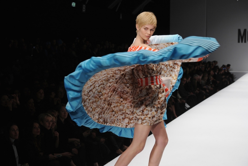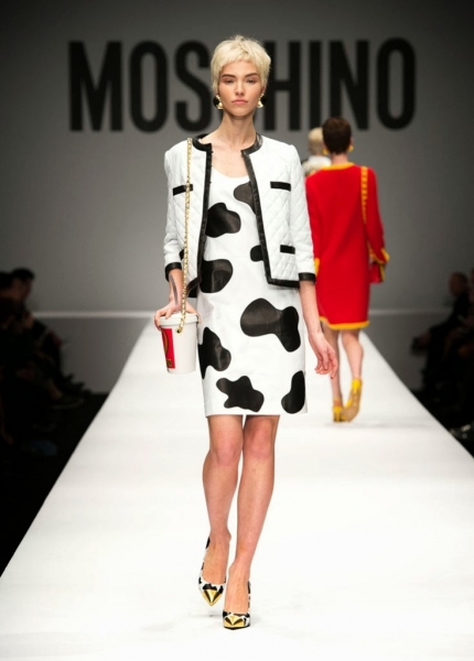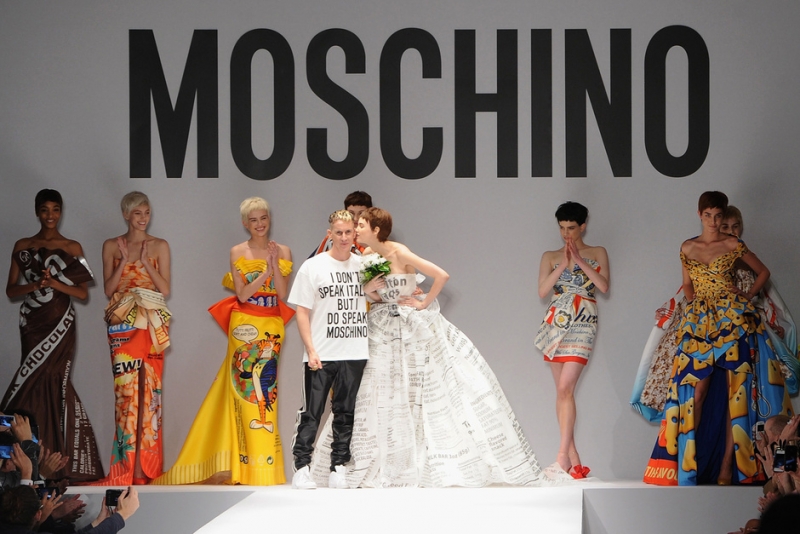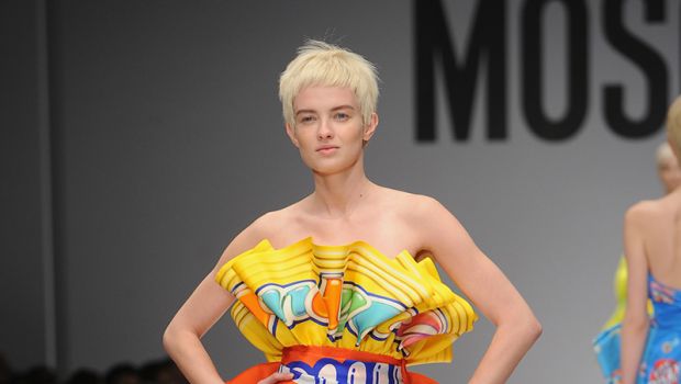 Scatole di pomodori tramutate in tubini, barre di cioccolato, caramelle e pop corn cavalcano la catwalk alla fashion Week milanese, per una passerella decisamente full color, che rende ironicamente indimenticabile ed eclettico l' esordio del nuovo direttore creativo della maison Moschino: Jeremy Scott.